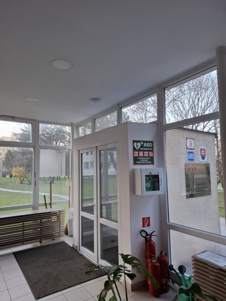 In case of an emergency, it is necessary to immediately contact the emergency number 155, which will coordinate the response and ensure access to the defibrillator through a trained staff member.