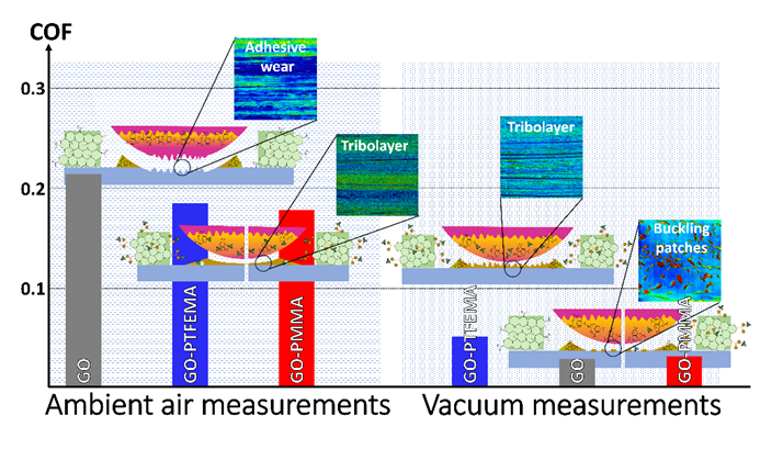 Obrázok: Vzťah koeficientu trenia (COF) pre vrstvy GO, GO-PTFEMA a GO-PMMA v atmosférickom tlaku a vákuu.